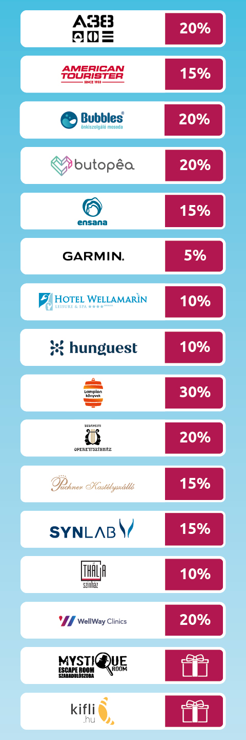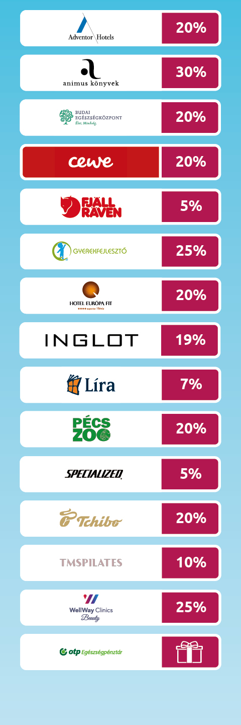 Állandó kedvezmények és időszakos kuponajánlatok várják partnereink kínálatából különböző kategóriákban: Egészség, Optika, Szabadidő, Szórakozás, Kultúra, Étel-Ital.